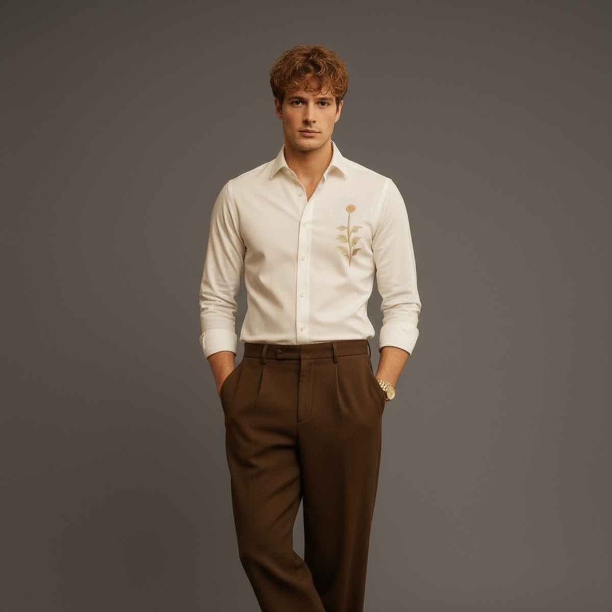 Pehanoge Flora Shirt | Giza Cotton | Sunflower Embroidery | Earth-Toned Luxe Edition