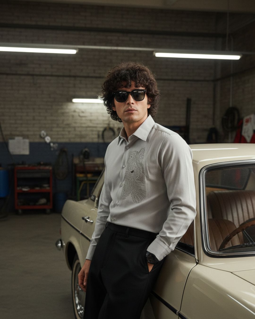 Premium Giza Cotton | Silver Ice Grey | Tigris Crest Embroidery | Lightweight | Breathable | Wrinkle-Resistant | Tailored Elite Fit | Luxury Formal Shirt